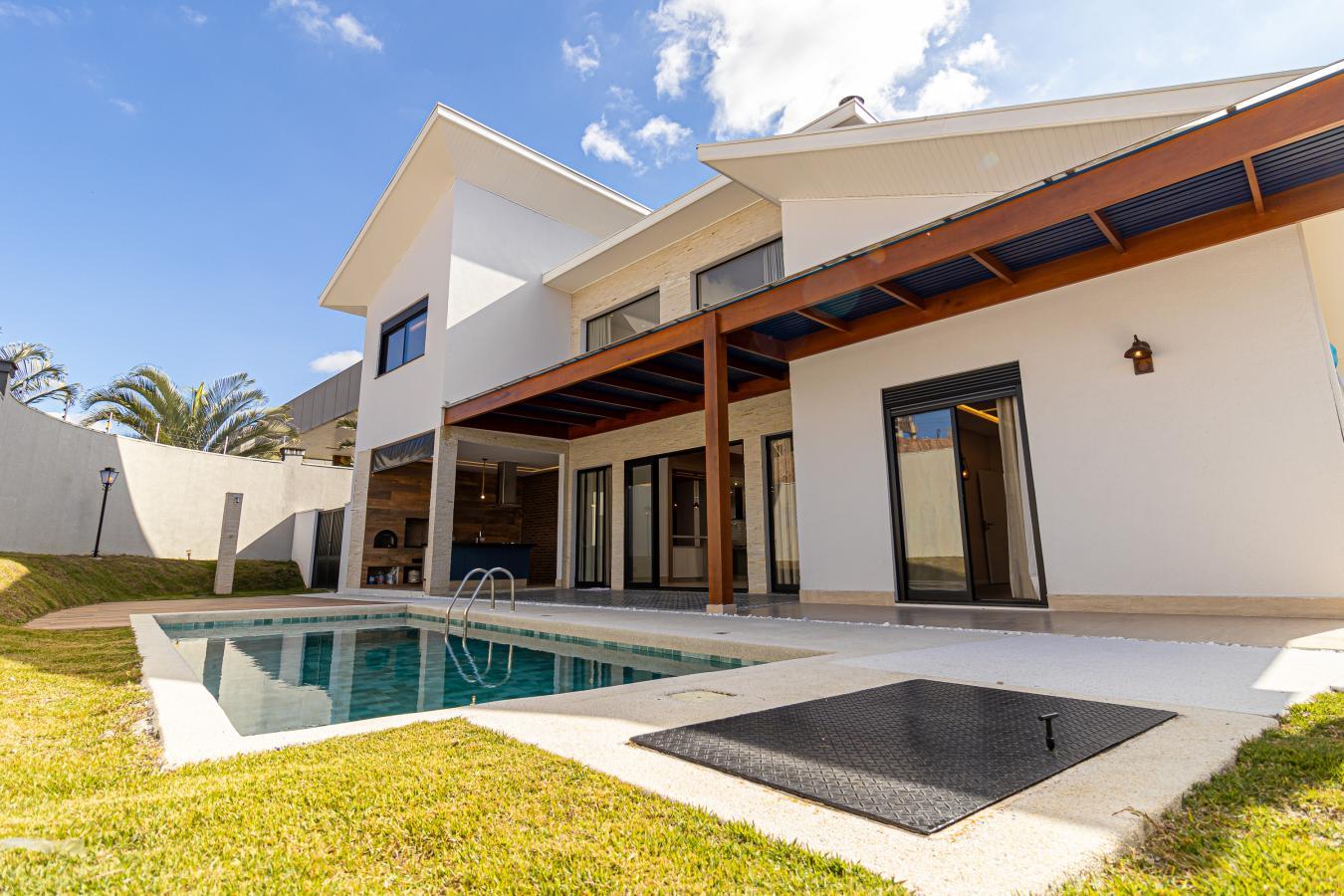 - Sala de 3 ambientes em conceito aberto, integrando a sala principal à área gourmet com churrasqueira e piscina.