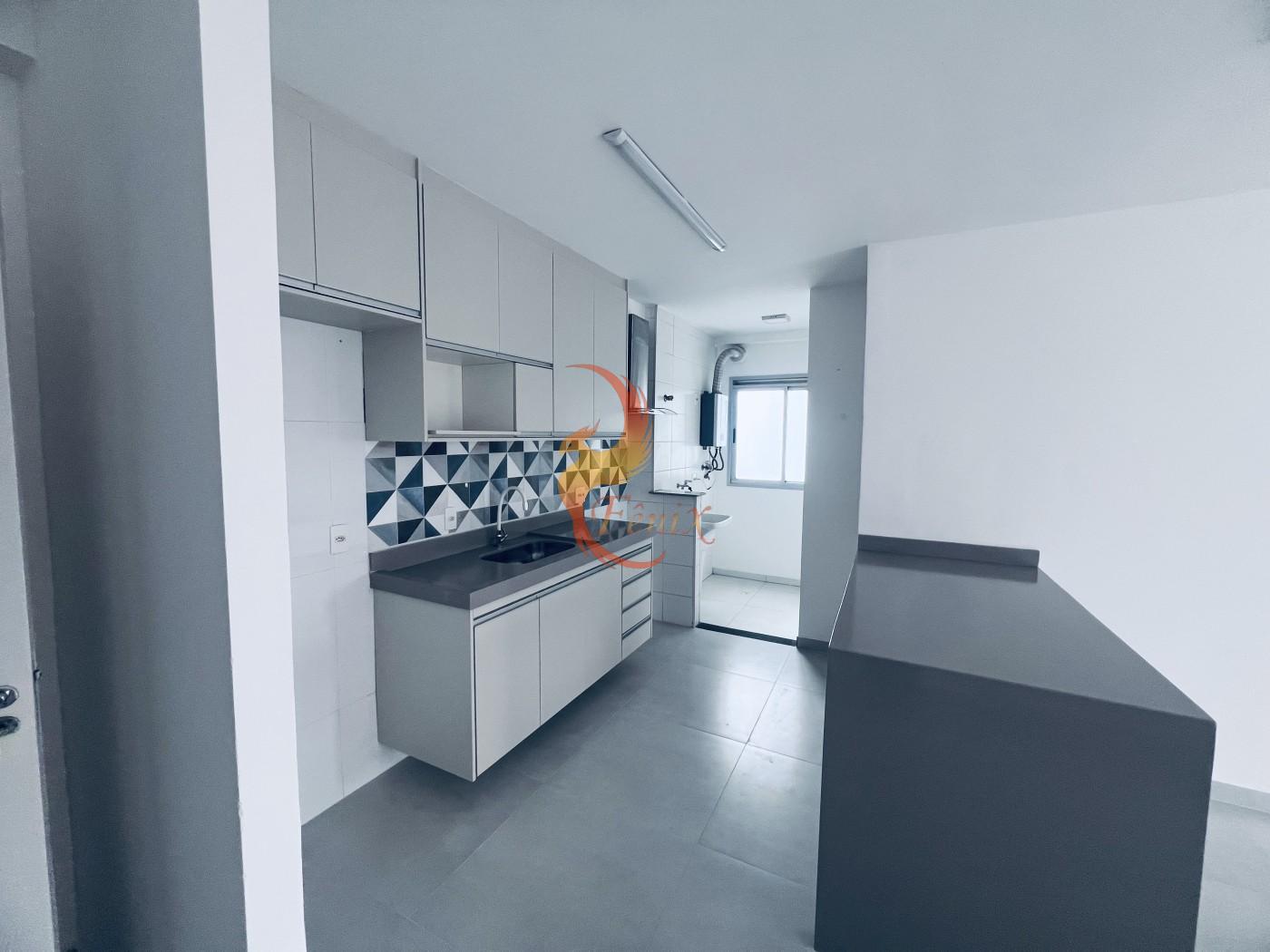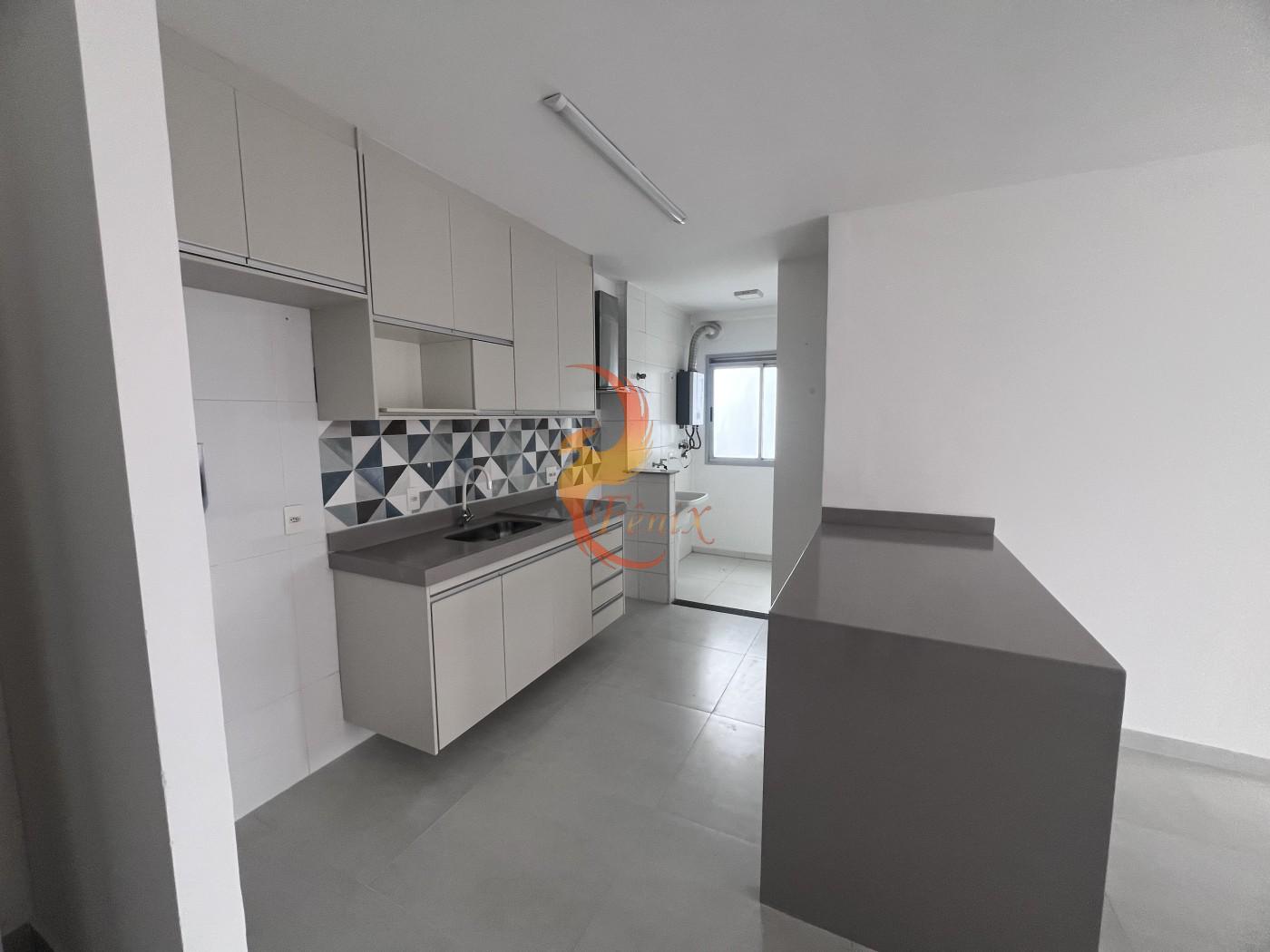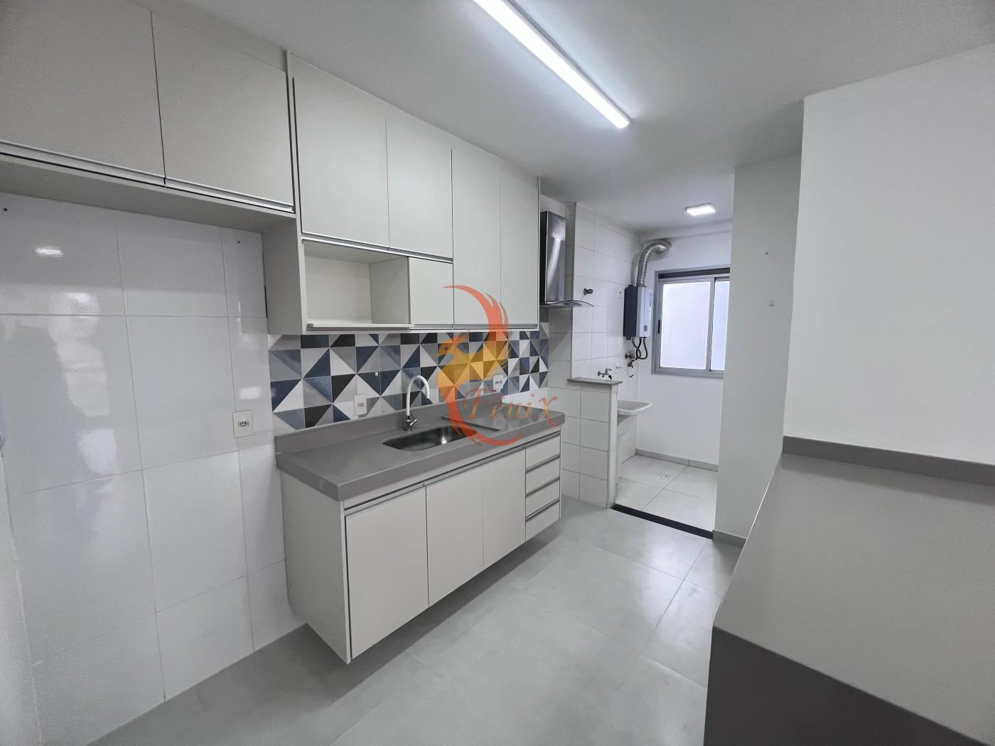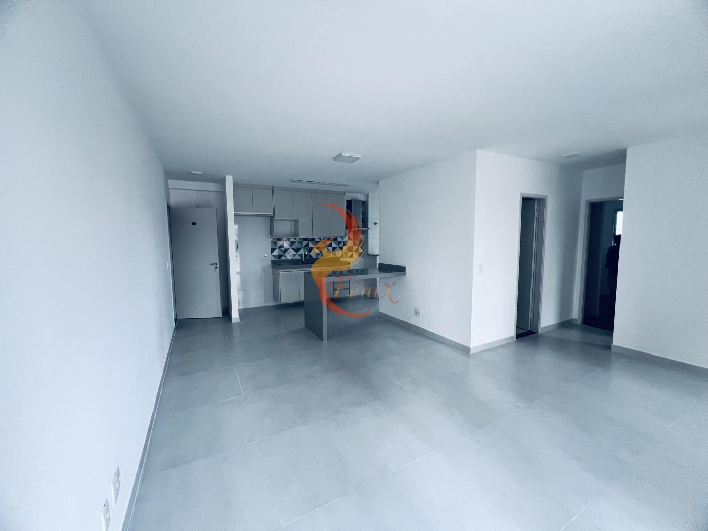 O apartamento conta com piso em porcelanato, armários planejados nos quartos e na cozinha, e um design moderno e funcional.