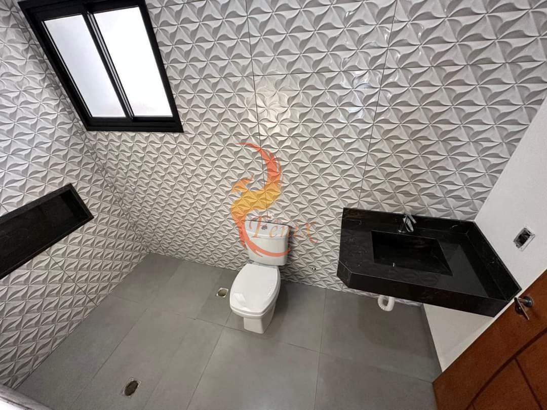A cozinha se destaca pela bancada em granito e frontão com revestimento 3D, agregando modernidade e personalidade ao espaço. O jardim de inverno também favorece a área íntima, especialmente a suíte master, que possui janela voltada para esse ambiente acolhedor. A casa dispõe ainda de lavabo, dois quartos espaçosos e banheiro social, todos com acabamentos de bom gosto e nichos embutidos. Os pisos em porcelanato reforçam a elegância e a praticidade no dia a dia.