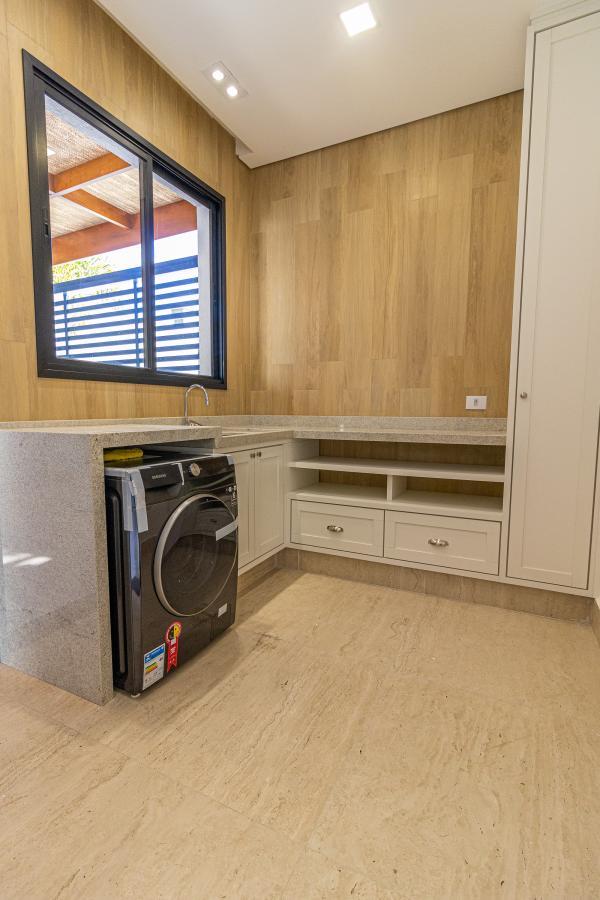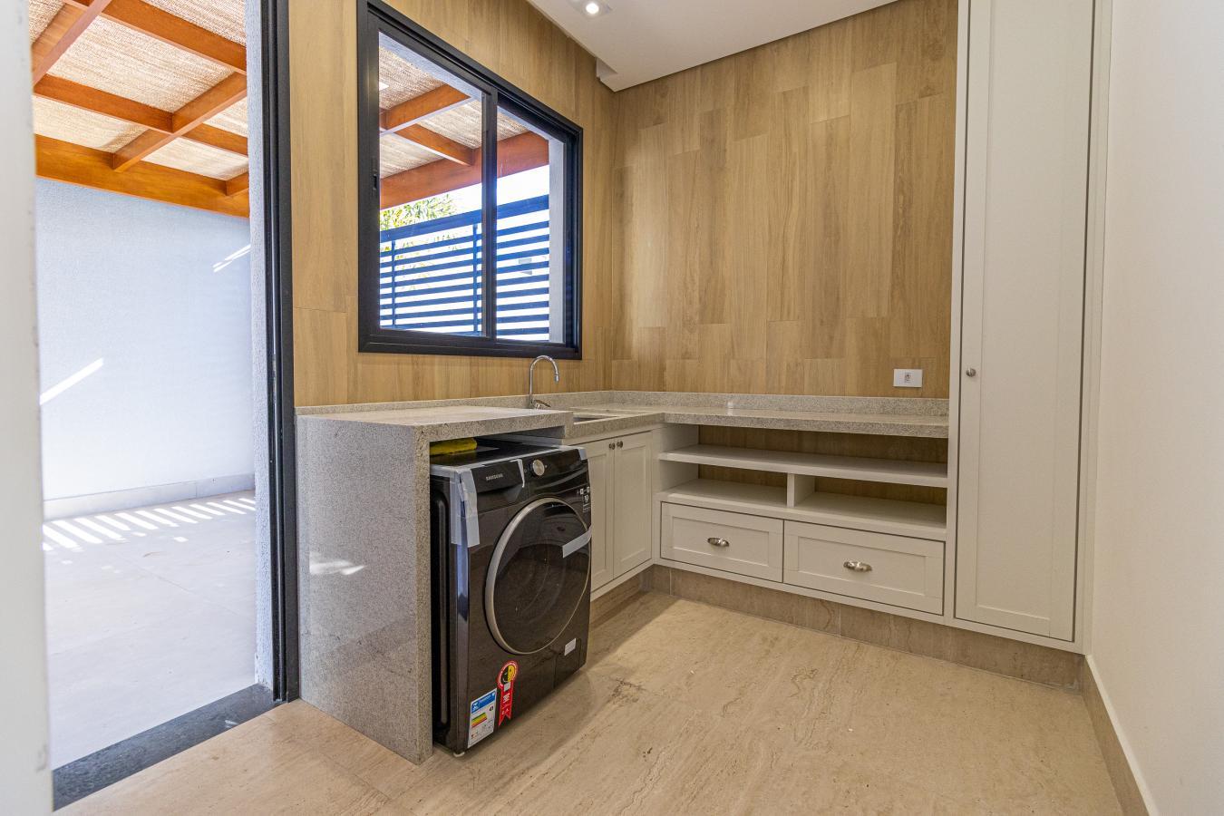 - Lavanderia com armários, iluminação e máquina de lavar nova instalada.