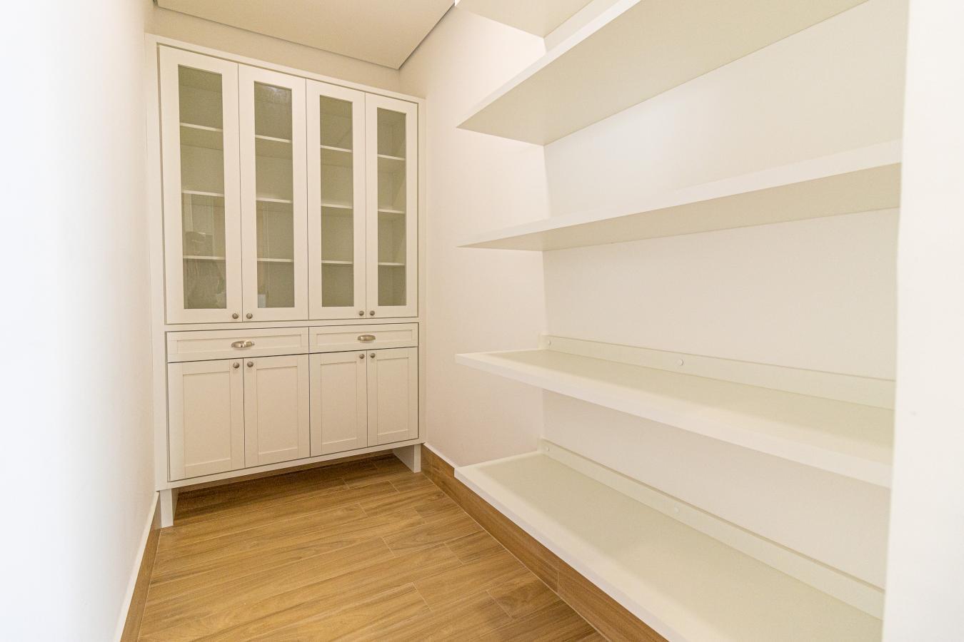 - Despensa ampla com armários planejados para organização.