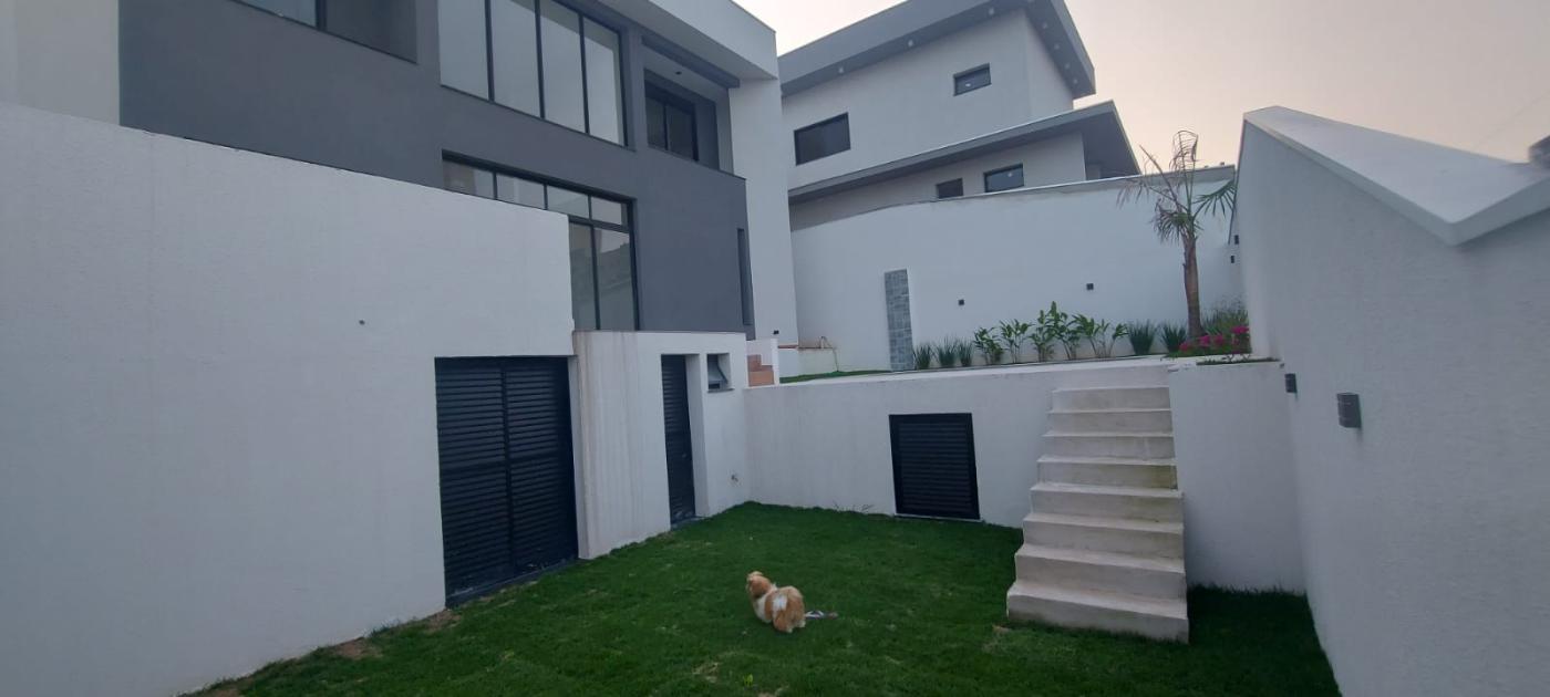 O imóvel conta com quatro suítes, sendo três no piso superior – incluindo uma suíte master espaçosa com estrutura para closet, persianas automatizadas, infraestrutura para ar-condicionado e duas suítes com varanda – e uma suíte reversível no térreo, perfeita para ser utilizada como escritório com entrada independente. A área social é ampla, integrada e impressiona pelo pé direito elevado entre 5,50m e 6,50m, com cozinha, salas de estar e jantar voltadas para o jardim interno e a área de lazer.