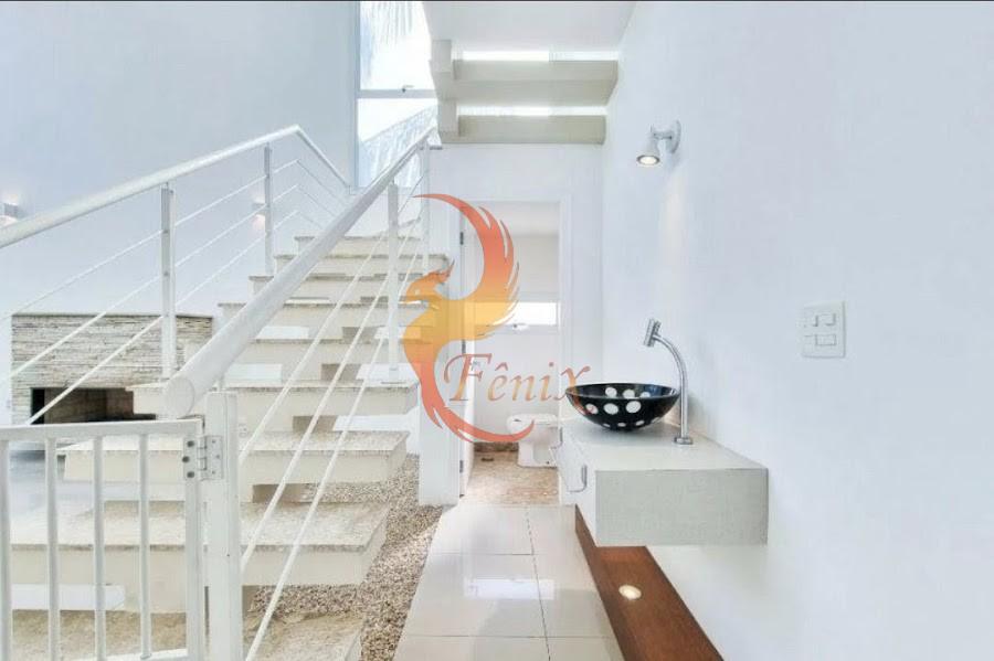 No piso inferior, a casa conta com sala de TV com ar-condicionado, sala social aconchegante com lareira, sala de jantar integrada à área gourmet, lavabo, cozinha ampla com armários planejados e despensa, área de serviço com armários e quarto de empregada com banheiro.