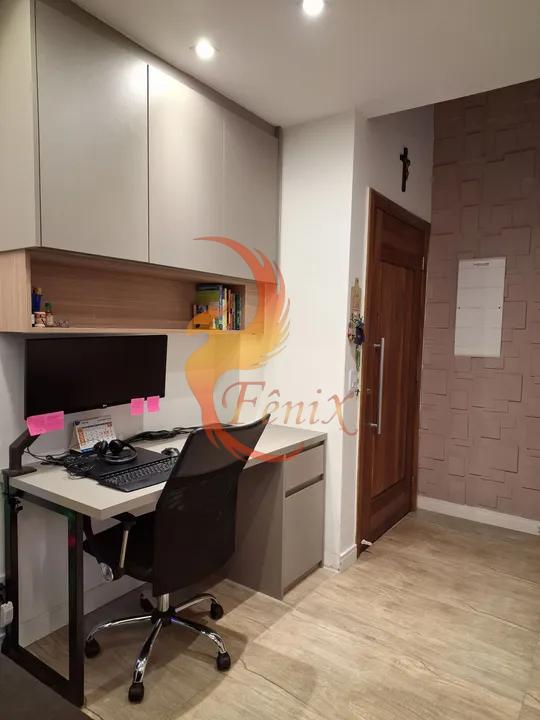 A escada possui acabamento em pedra, corrimão de inox e armário embutido abaixo, aproveitando cada detalhe do espaço. A lavanderia também conta com móveis planejados, garantindo organização e funcionalidade. Na sala, há um espaço de escritório com cristaleira planejada, incluindo nichos para adega e vinhos.