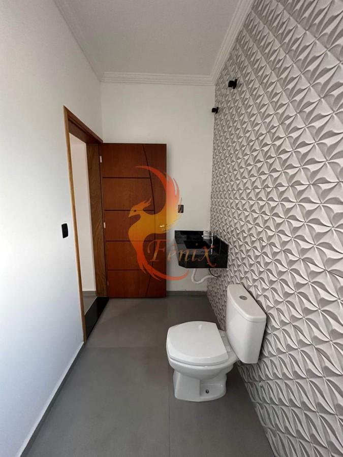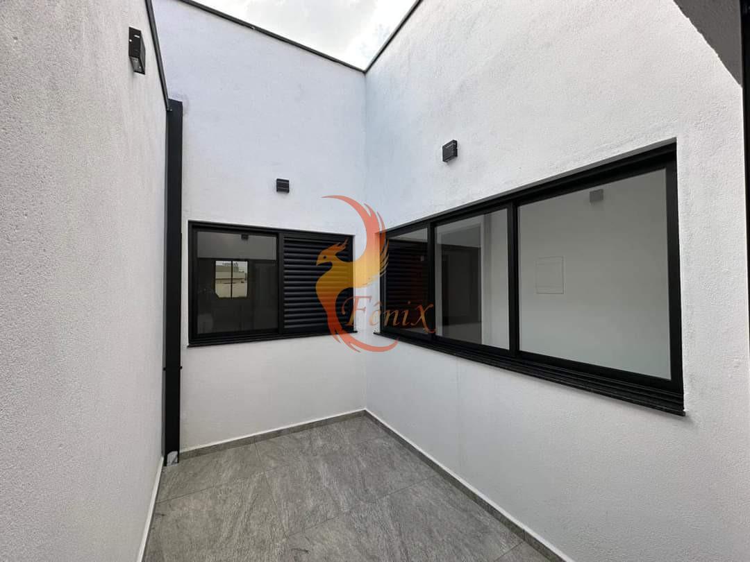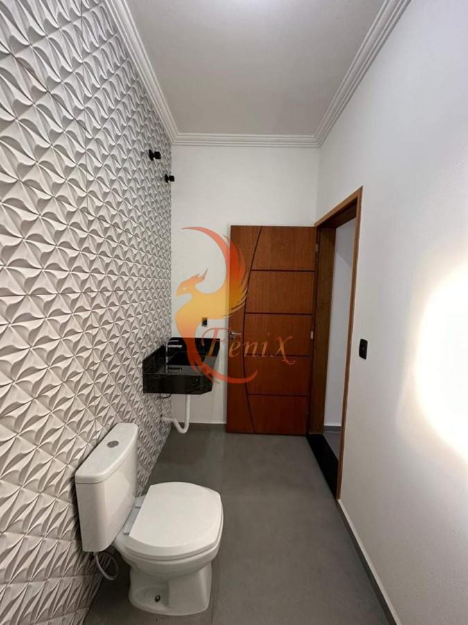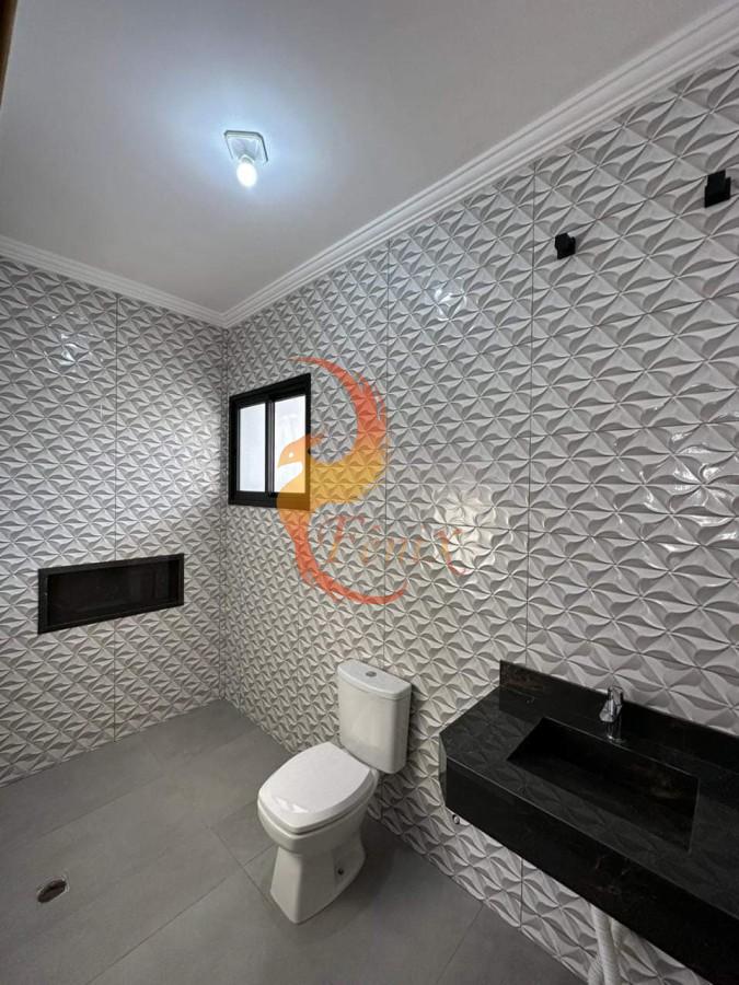 A cozinha se destaca pela bancada em granito e frontão com revestimento 3D, agregando modernidade e personalidade ao espaço. O jardim de inverno também favorece a área íntima, especialmente a suíte master, que possui janela voltada para esse ambiente acolhedor. A casa dispõe ainda de lavabo, dois quartos espaçosos e banheiro social, todos com acabamentos de bom gosto e nichos embutidos. Os pisos em porcelanato reforçam a elegância e a praticidade no dia a dia.